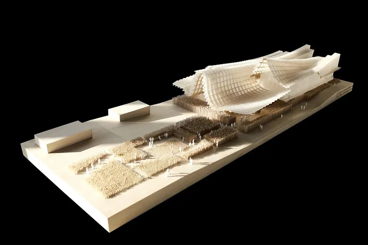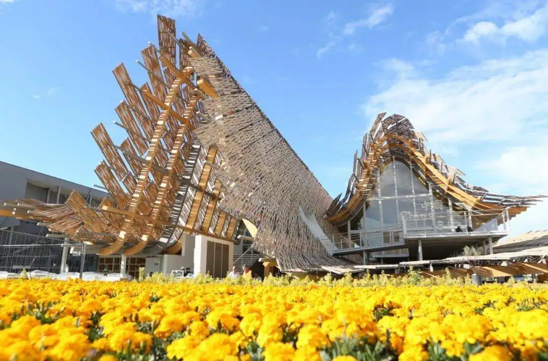 圖1-5 2015年意大利米蘭世博會(huì)中國國家館(圖片摘門中國設(shè)計(jì)在線),設(shè)計(jì)的主題是“希望的田野.生命的源泉”。設(shè)計(jì)理念正是基于對(duì)“天、地、人”的詮釋!疤斓厝撕汀碧N(yùn)含了中華民族的智慧與精神.傳播著中國博大厚重的文化精神、展示出泱洪大國的氣度與風(fēng)范。