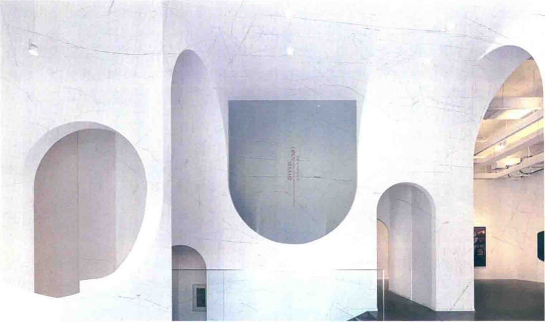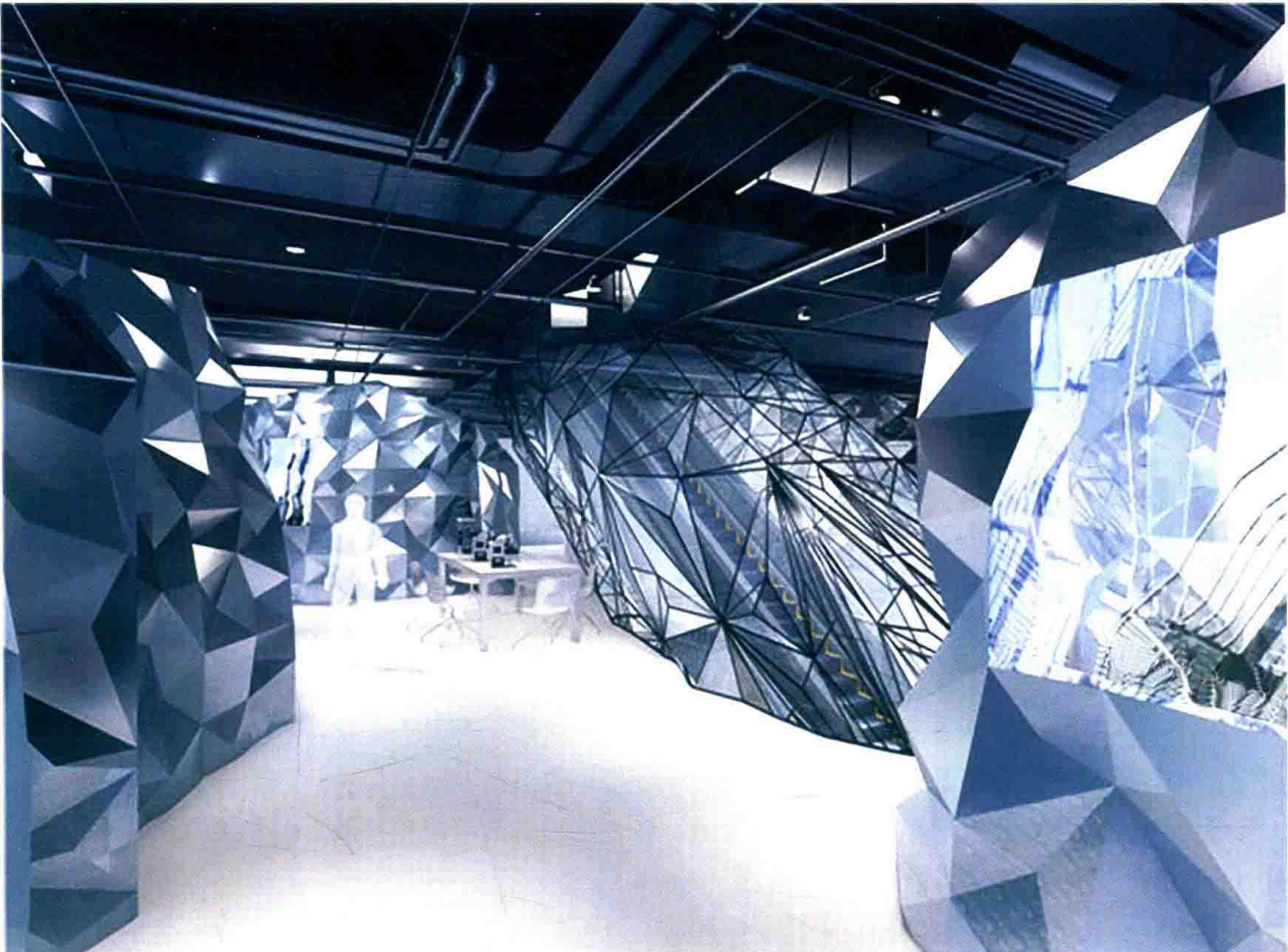 錯(cuò)視現(xiàn)象是人們在感應(yīng)外部世界時(shí)常有的一種知覺狀態(tài)。借錯(cuò)視可“將錯(cuò)就錯(cuò)”地調(diào)節(jié)視感,強(qiáng)化展示空間的心理感受。利用錯(cuò)視圖形形成的旋轉(zhuǎn)、閃爍、發(fā)射、波動(dòng)等動(dòng)蕩感,或用幻彩顏料畫的背景圖形,都可強(qiáng)化展廳的空間視覺效果(圖5-6 )。